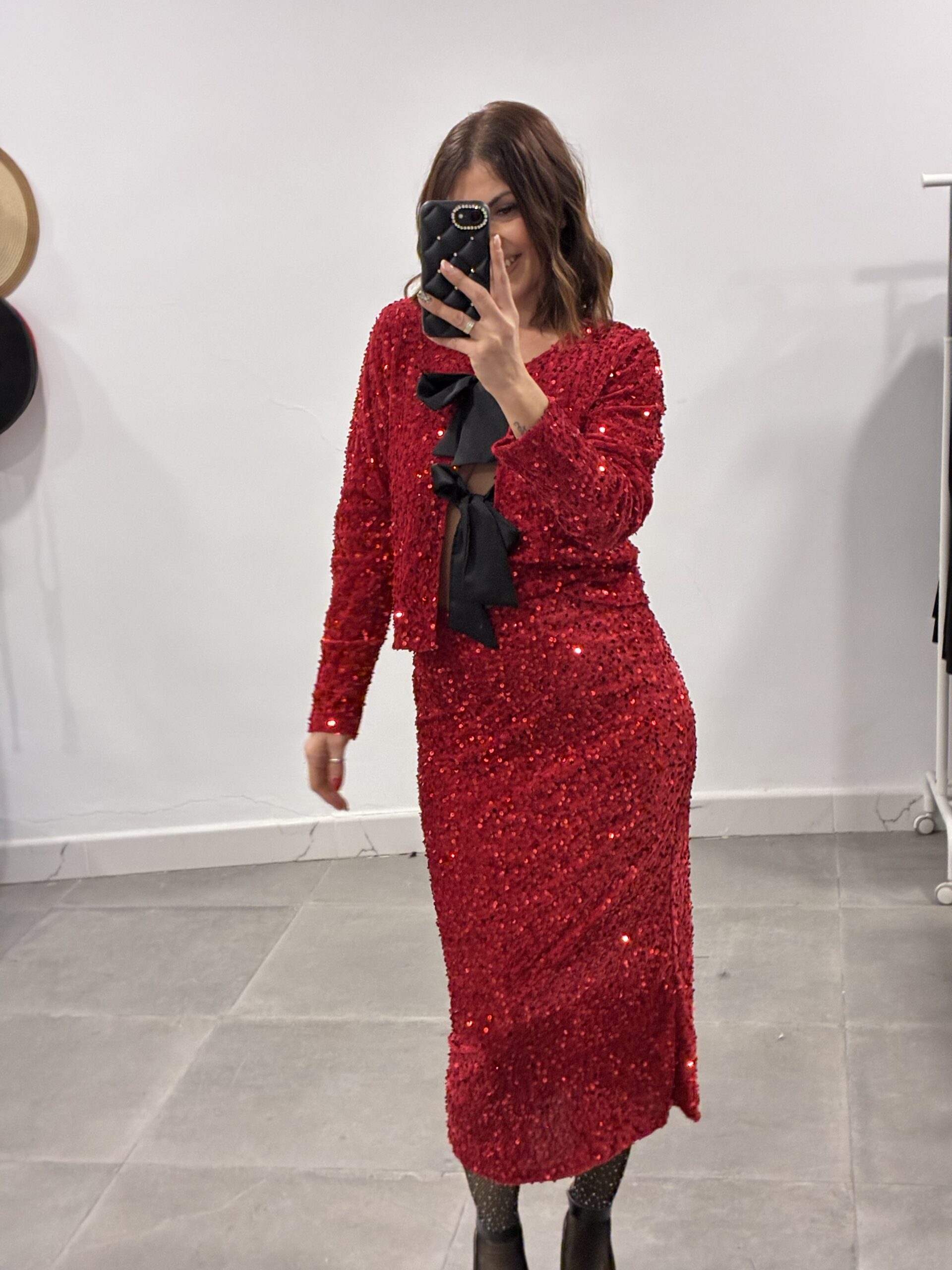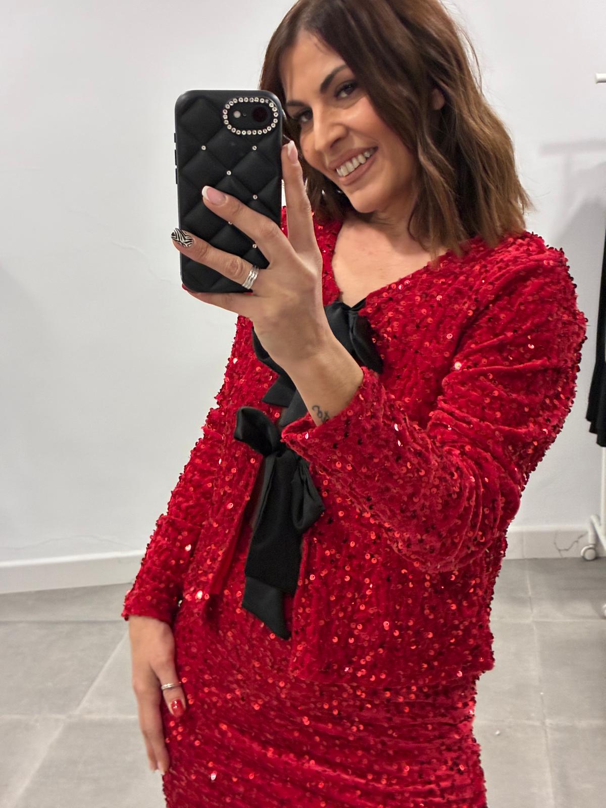 Conjunto lentejuelas falda de tubo con Rebeca con lazos de satén