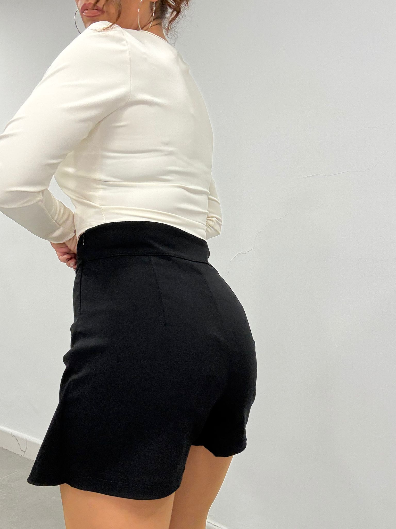 Falda pantalón negra elegante para mujer, de tiro alto y diseño cruzado, ideal para looks casual chic y outfits de vestir modernos.