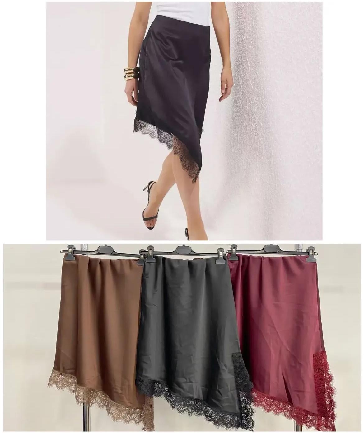 Falda satén asimétrica con encaje en borde y apertura lateral, talla única