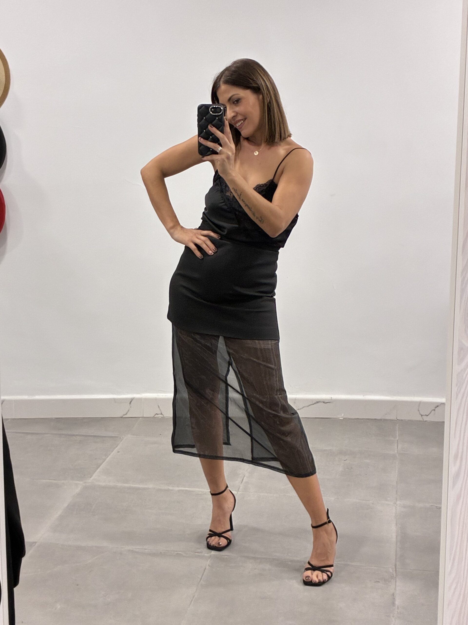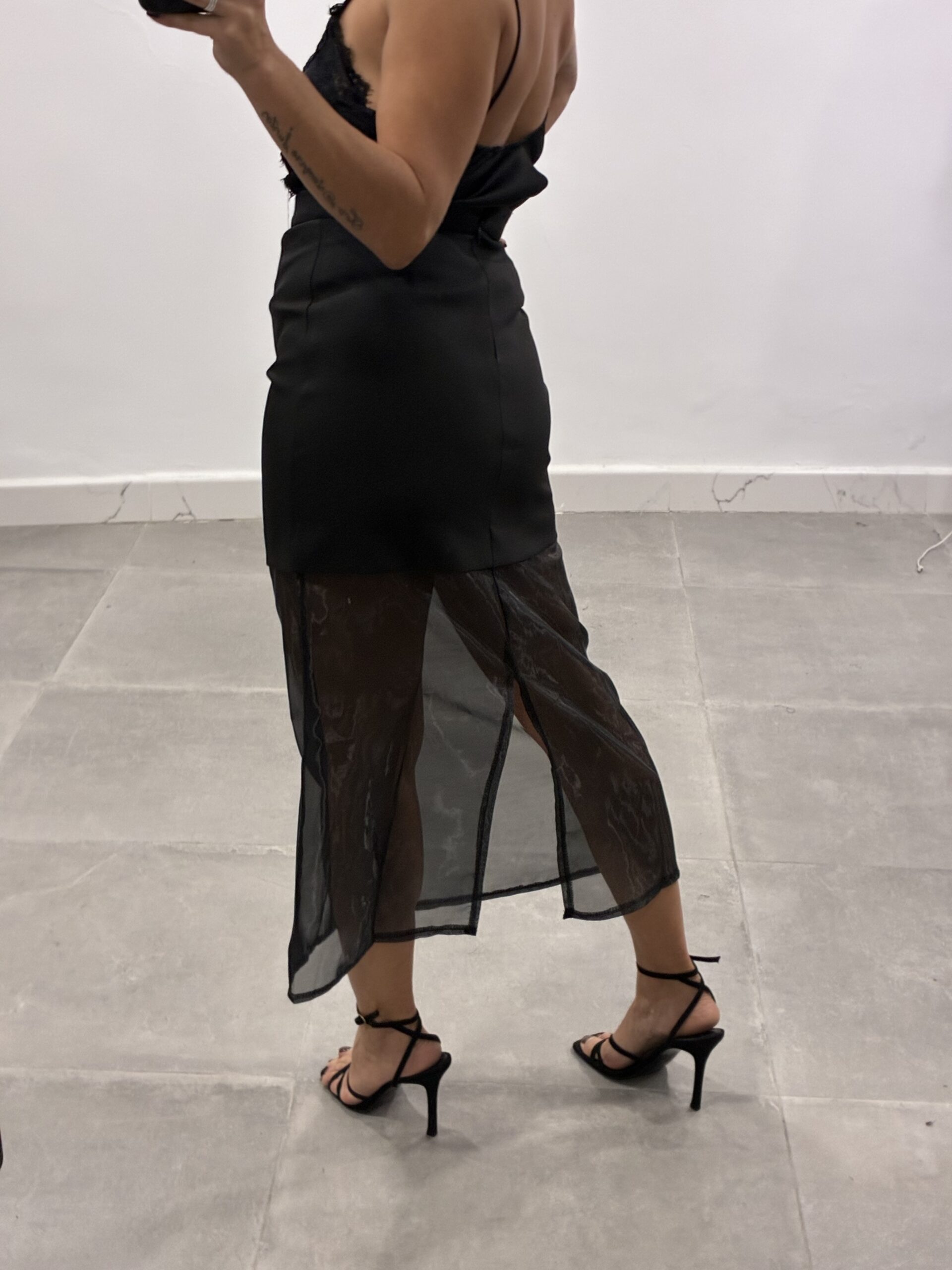 Falda midi con cuerpo en tela y pinzas y caída en tul con apertura trasera! Por tallas S y M