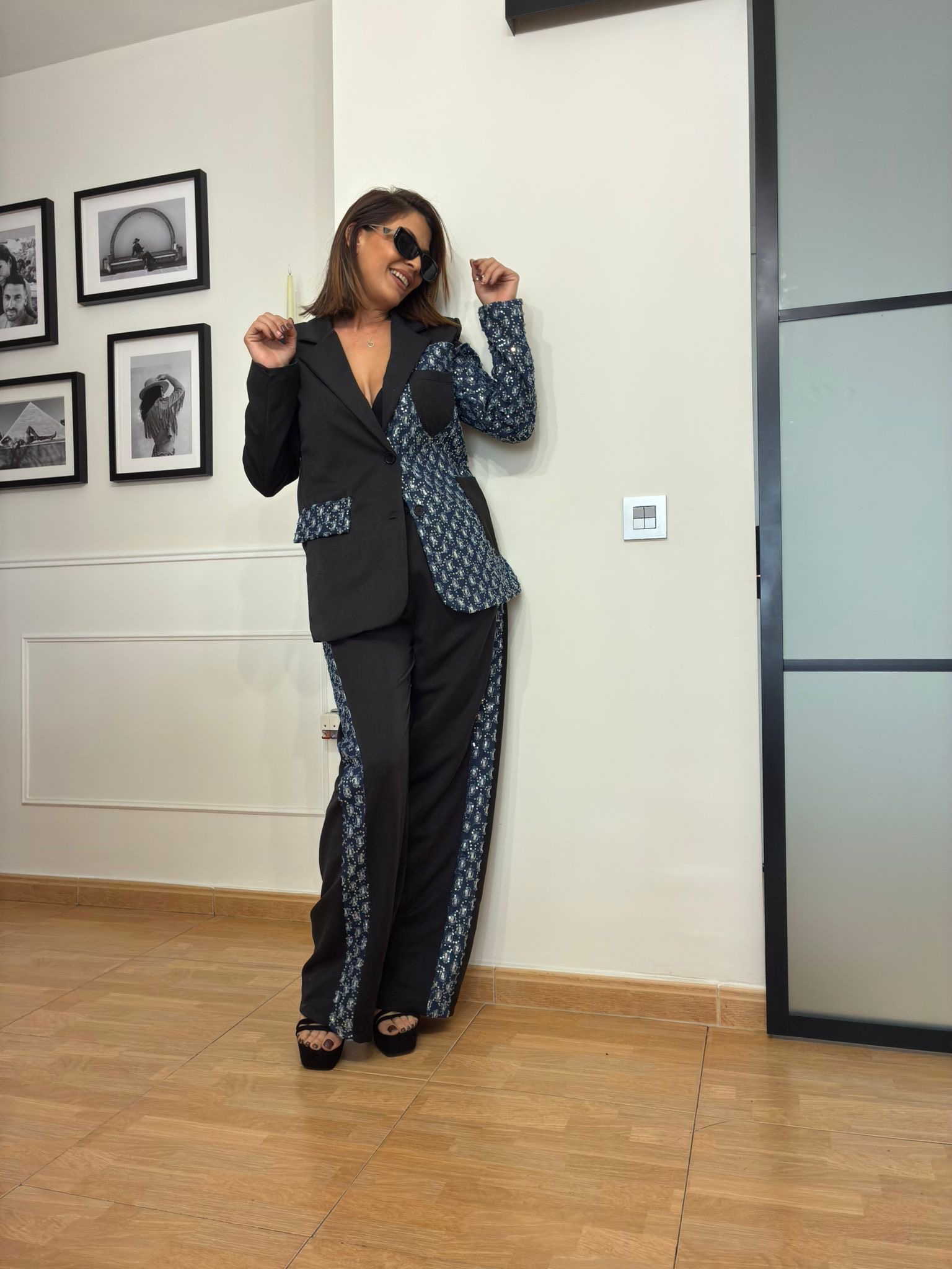 Pantalón de traje con banda lateral combinada con jeans y lentejuelas. Talla única