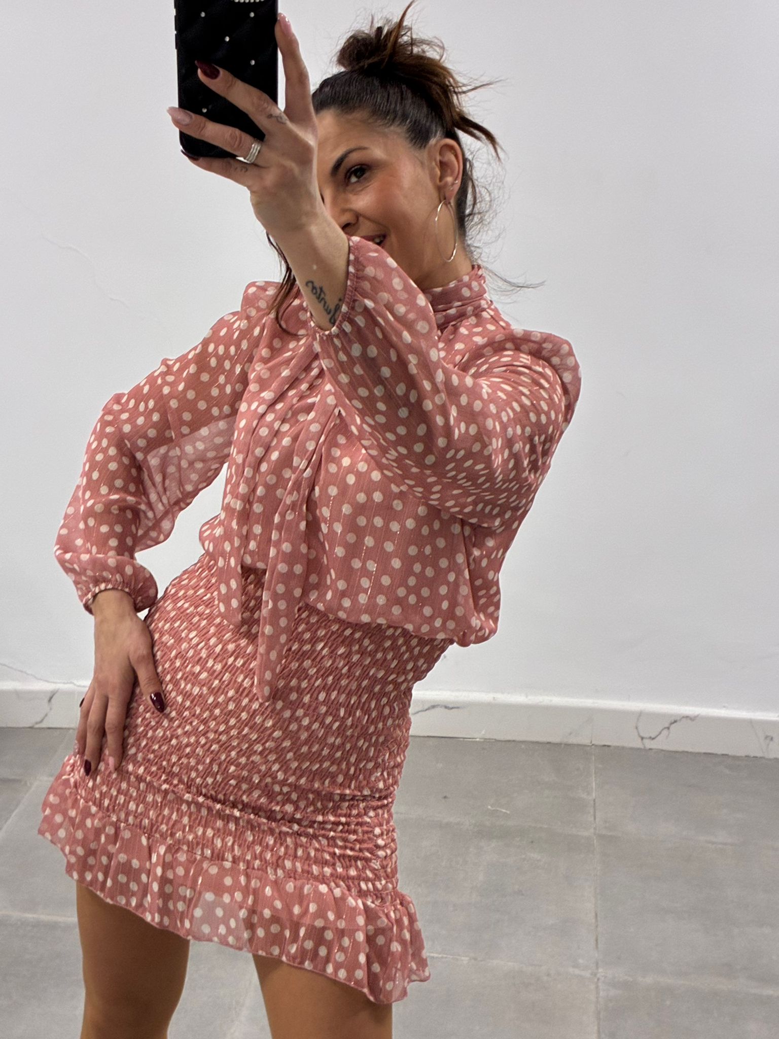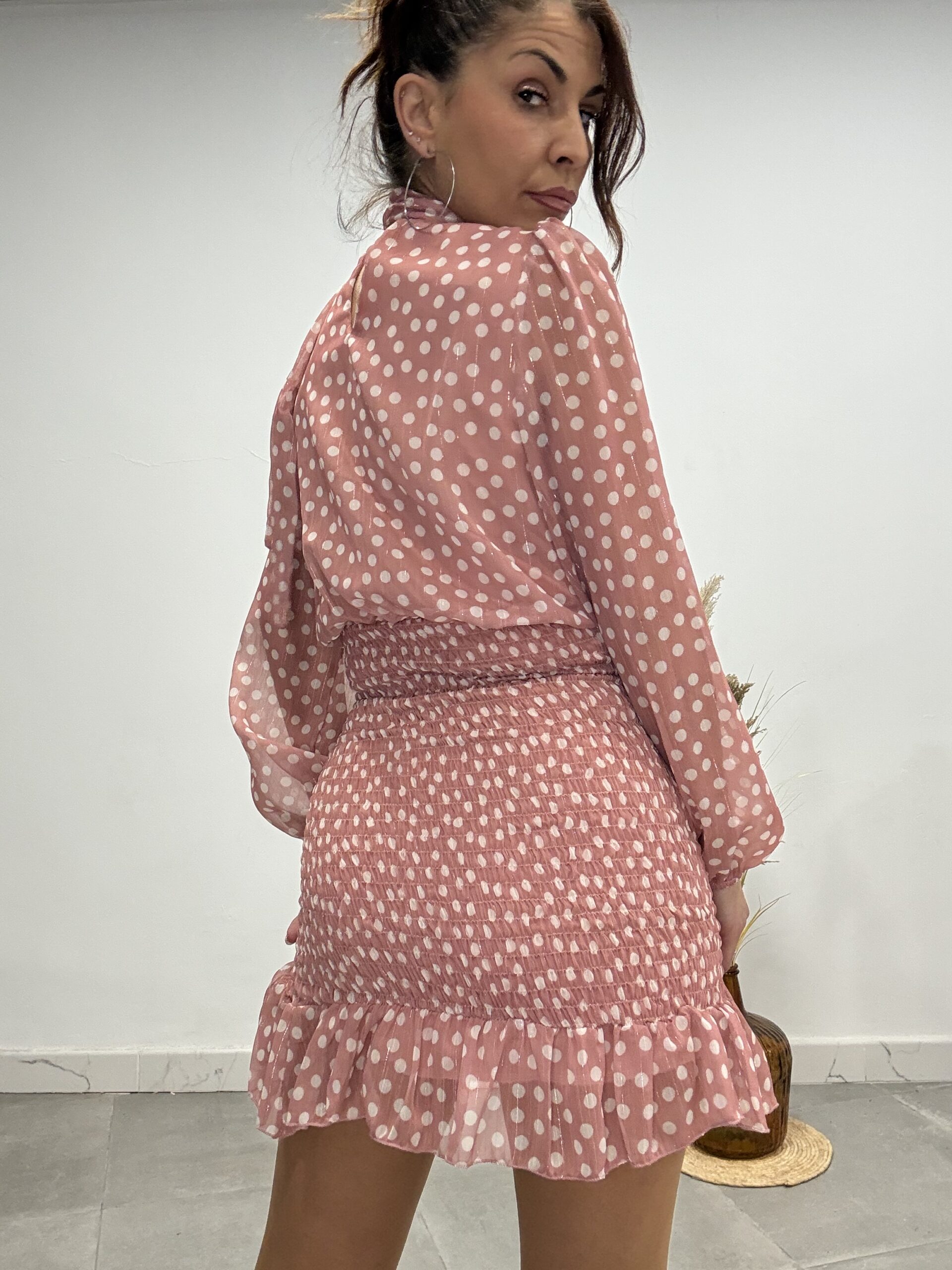 Vestido de lunares con hilos en plata, estilo romántico, forrado y fruncido con acabado en volante, talla única, dá hasta la L